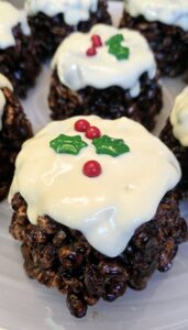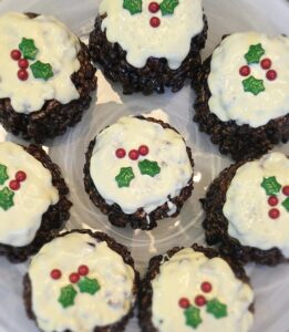 I made puffed wheat Christmas Puddings for Christmas this year (2024) and they not only taste delicious, but are adorable! Merely spray a cupcake tin with baking spray and add an extra cup of puffed wheat (8 cups), then scoop some into the cup, flattening the top with a spatula. Just pop into the fridge to set and pop it out of the cup with butter knife (it’ll come out very easily, just needs a tiny push). Melt some white chocolate (no need to add any oil) and put a generous teaspoon on top, kind of pushing over the edges, and top with some sprinkles.