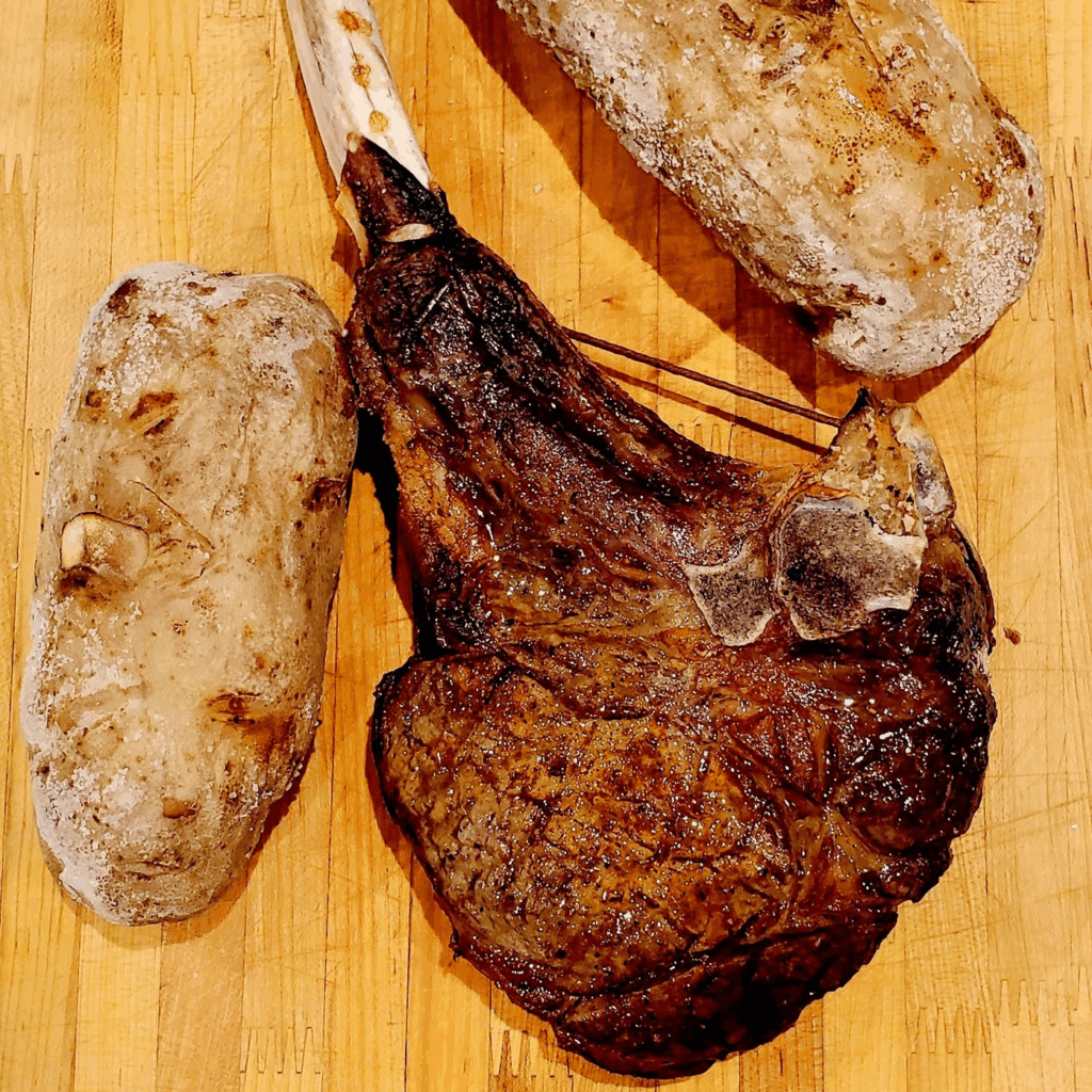 Tomahawk steak is one of our favourite steaks. Done right, a tomahawk steak is juicy, delicious, and cuts like butter. The only seasoning it needs is salt!